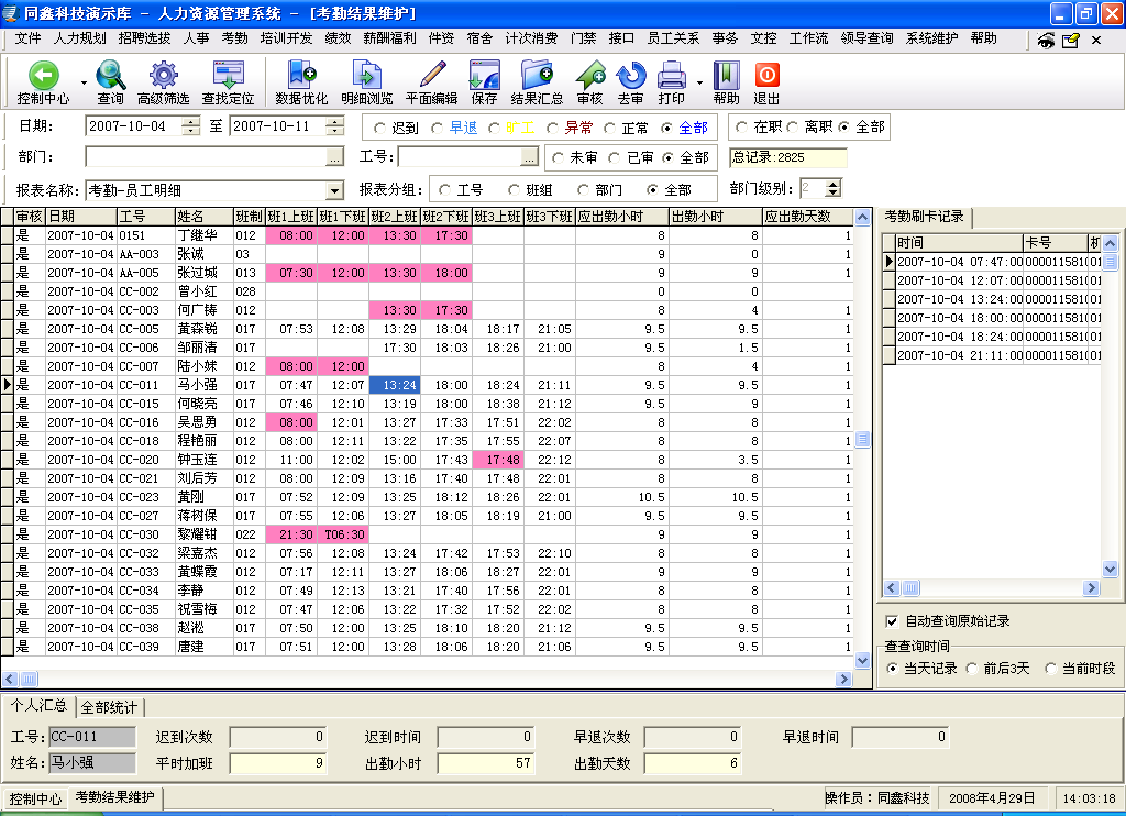 人事模塊的圖表處理與考勤異常處理模塊中的異常顏色的設置,使系統的可視化操作更突出,操作員可以通過圖形的方式進行數據查詢,數據異常使用不同顏色突出顯示,大大提高了操作員方便性;