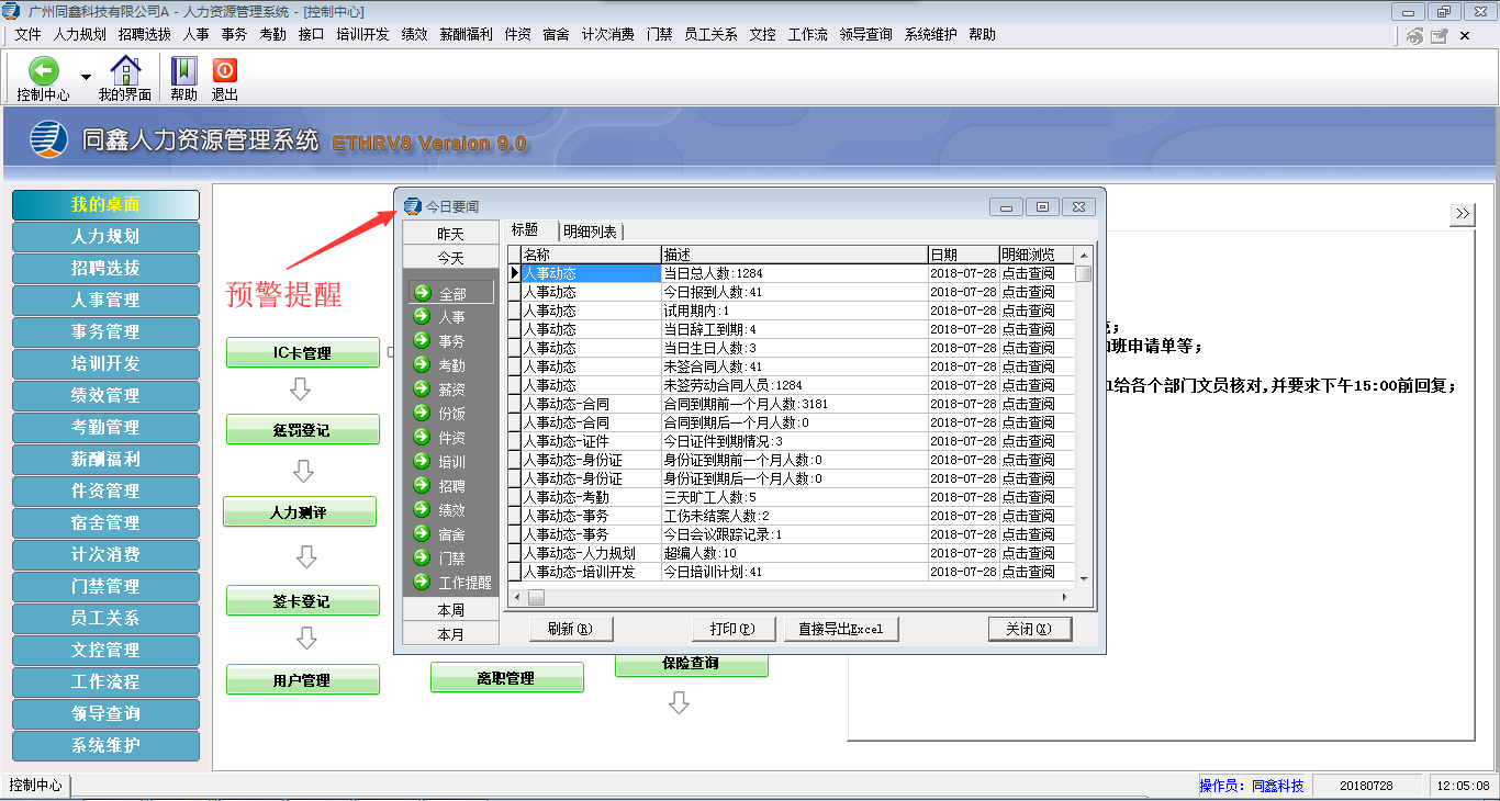 如上所示,用戶一登錄系統,即彈出預警提醒與人文關懷結合的信息,如當天總人數,當天報到人數,當天辭工到期人員,當天生日人數,當天入職紀念日人數以及未簽勞動合同人數、未投保人數,合同證件到期人數等,預警提醒信息可以依據客戶需求自定義,雙擊即可查找或導出明細,一目了然。
