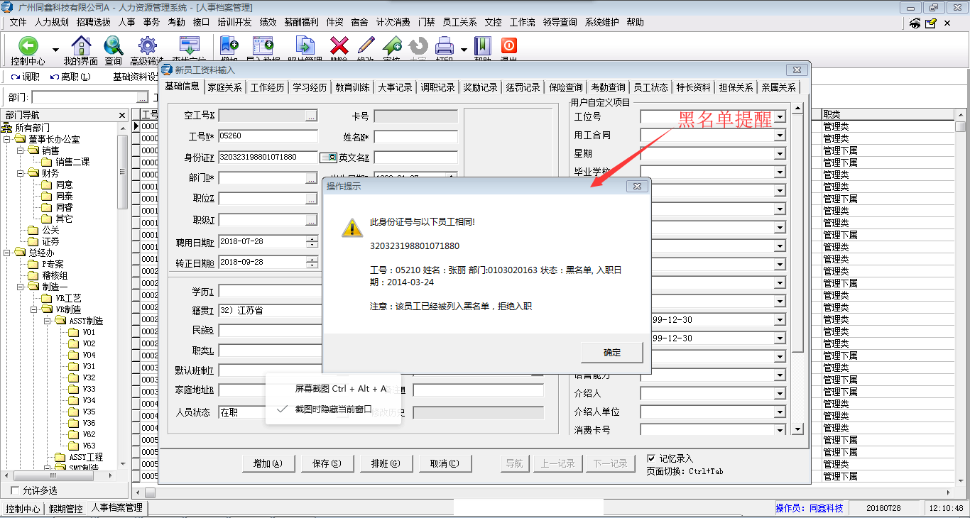 新員工入職時黑名單提醒: