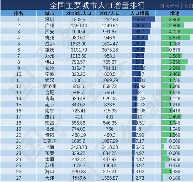 城市間的競爭,根源是人口的競爭,根據數據統計,2018年全國人口增量和增速排名第一的皆是深圳。